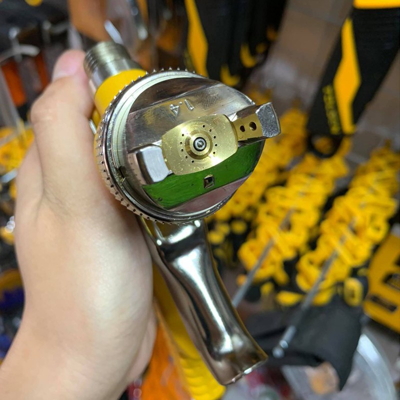 Súng sơn màu vàng kèm theo cốc sơn 600 ml.
