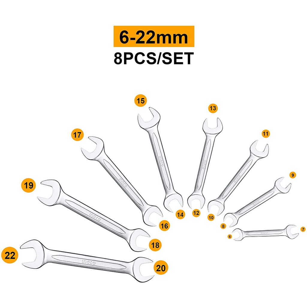 Bộ 8 cờ lê 2 miệng ( 6-22 ) Ingco HKSPA2088Thông số kỹ thuật: