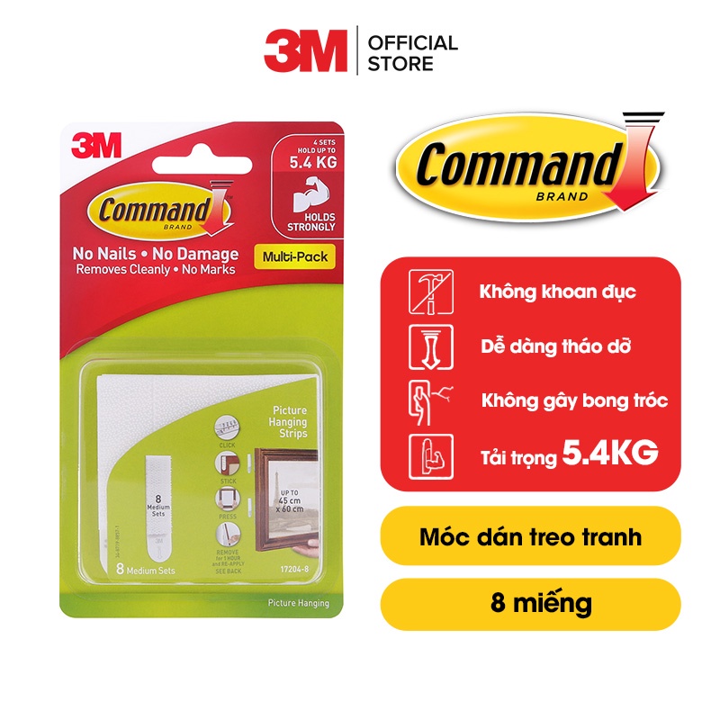 Nhà cửa & Đời sống > Sắp xếp nhà cửa > Móc treo || Bộ 8 Miếng dán treo tranh Command 3M tải trọng 5.4kg dễ sử dụng, độ bền cao, bám cực chắc, tháo cực dễ 17206Còn hàng