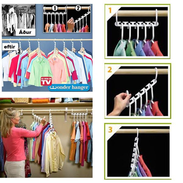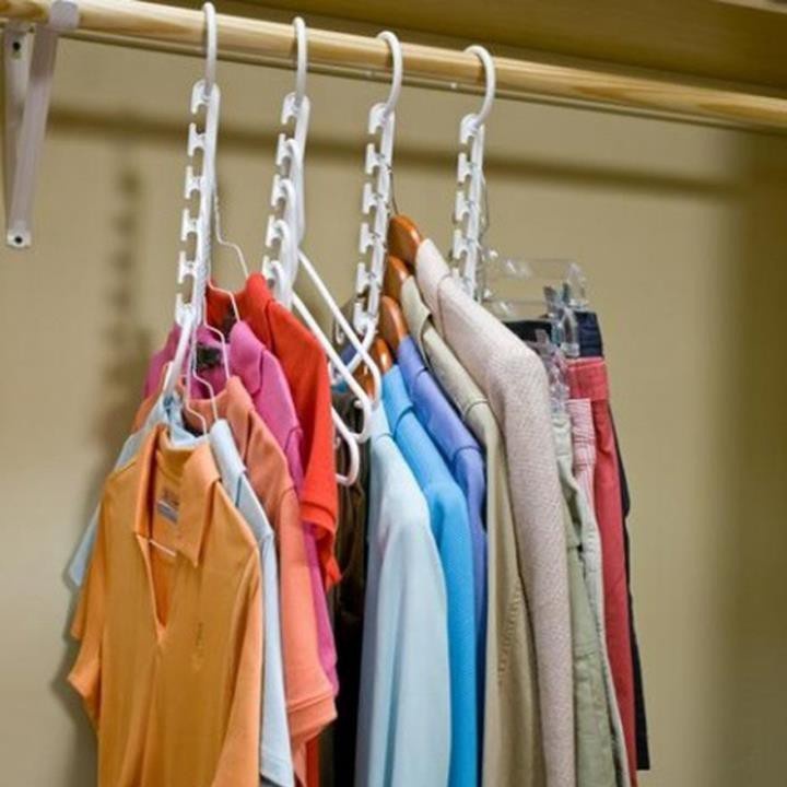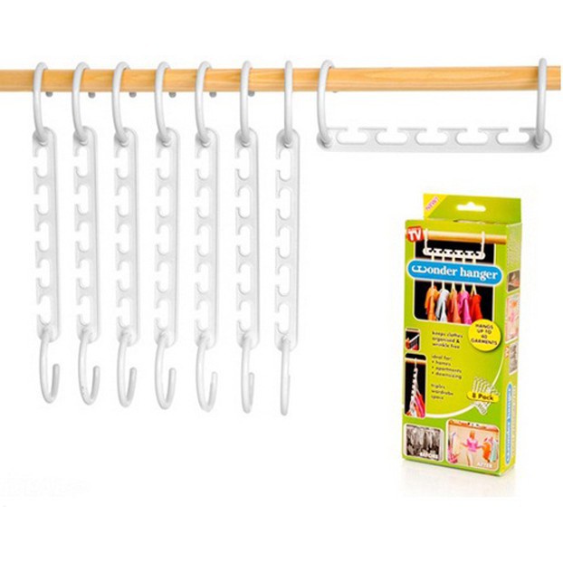 Bộ 8 móc treo quần áo thông minh gồm 8 móc, mỗi móc treo được 5 áo hoặc quần, và cả các loại túi xách, khăn, hay cà vạt....với tổng trọng lượng treo lên tới 5 kg.- Móc treo giúp bạn sắp xếp tủ quần áo gọn gàng, dễ tìm kiếm, dễ lấy, đồng thời giúp quần áo luôn phẳng phiu, đẹp mắt.