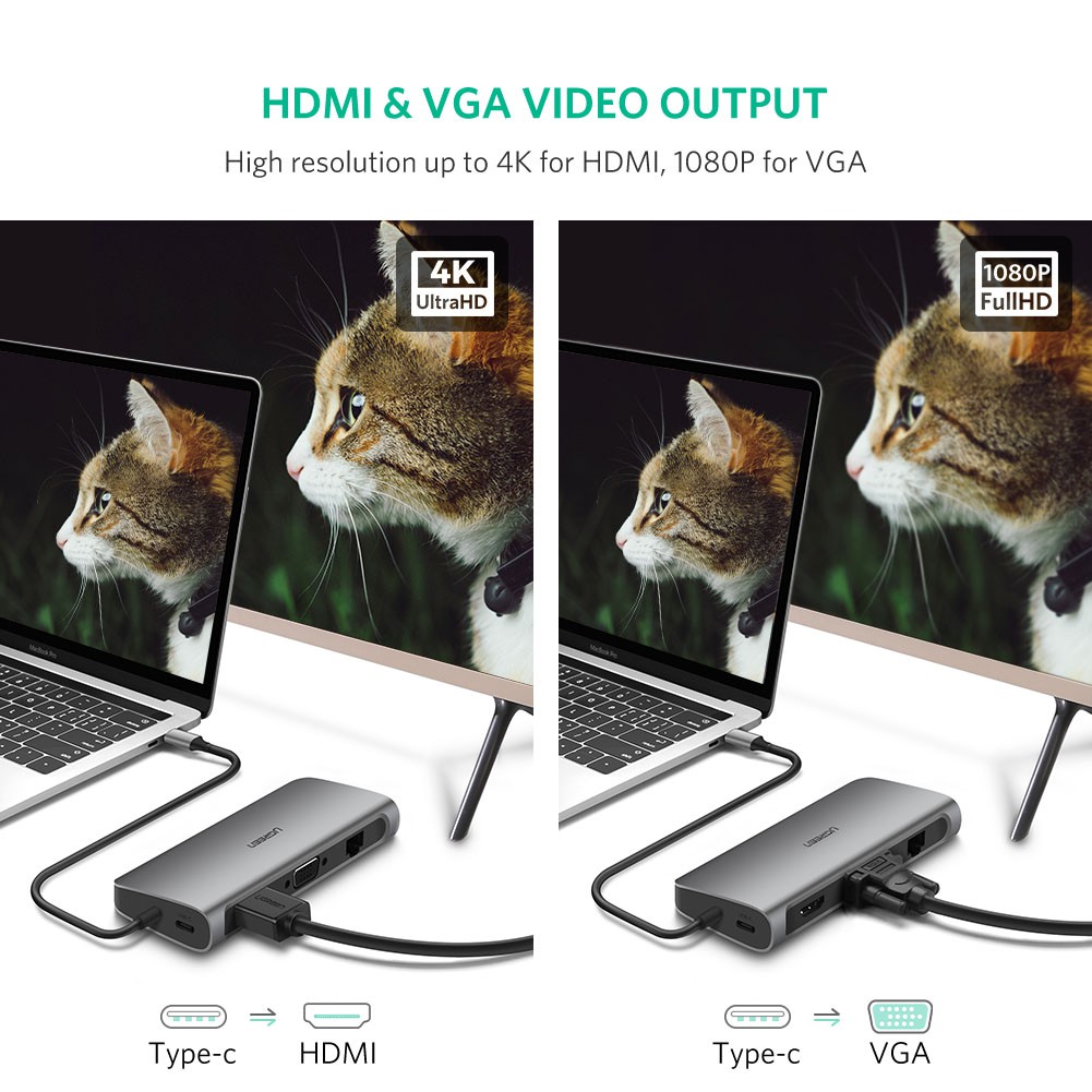 ➖ Chính Hãng Ugreen 40873 giải pháp hoàn hảo giúp kết nối MacBook với cổng USB Type C ra màn hình HDMI trên tivi với độ phân giải lên đến 4K/30hz ( 4096x2160p ) & VGA (1920x1080p/60hz )