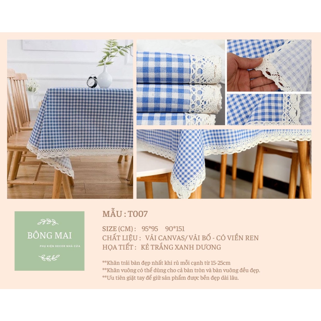 [110*160cm] Khăn trải bàn vải canvas họa tiết kẻ nhí VIỀN REN phong cách Nhật Bản nhẹ nhàng vintage [T007]
