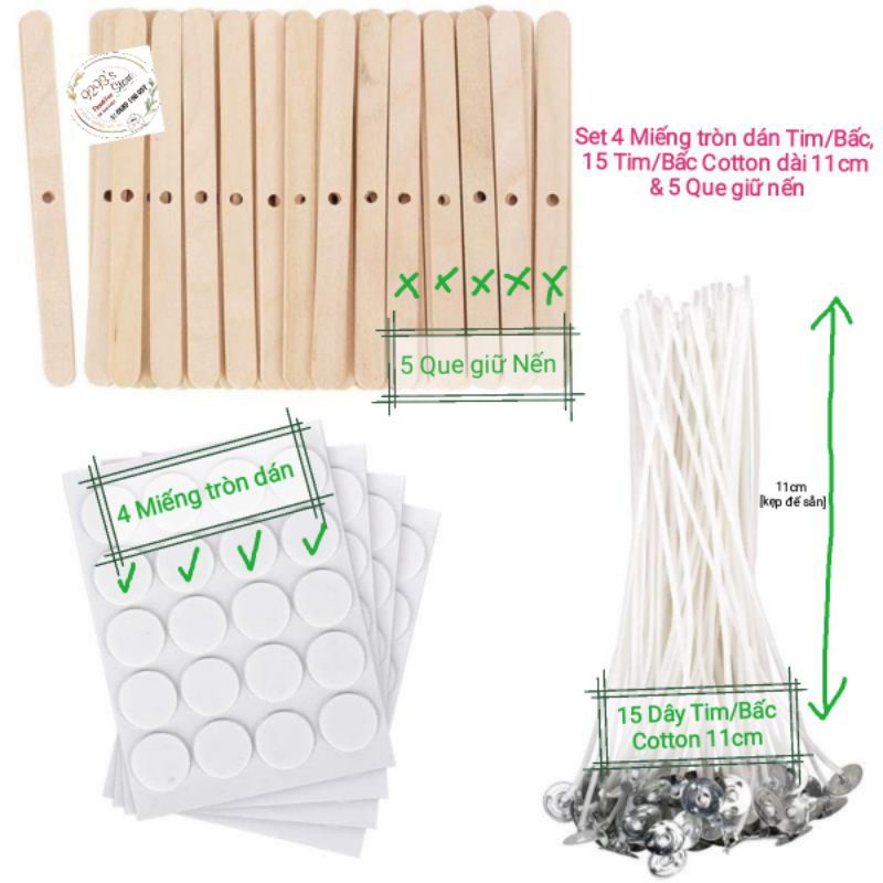 Sản phẩm gồm 3 Nguyên liệu - Dụng cụ:- 15 Dây Tim/Bấc Cotton nhúng qua sáp kẹp đế sẵn, thắp hạn chế khói tối đa, dùng tốt cho các loại sáp