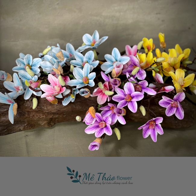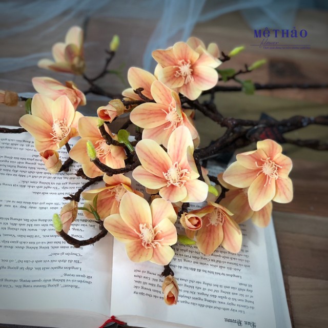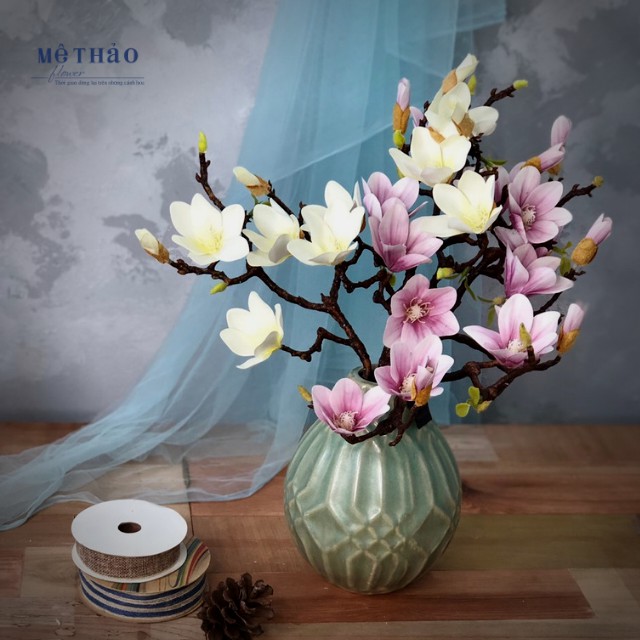 - Cành hoa hài hòa với phần thân giả cổ đúng hình dáng cành mộc lan, lá mầm xanh nhỏ xinh chân thật