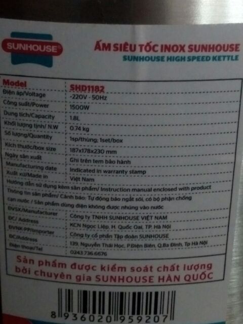 Thiết Bị Điện Gia Dụng > Đồ gia dụng nhà bếp > Ấm đun siêu tốc || Ấm siêu tốc SUNHOUSE SHD1182Còn hàng