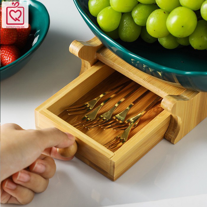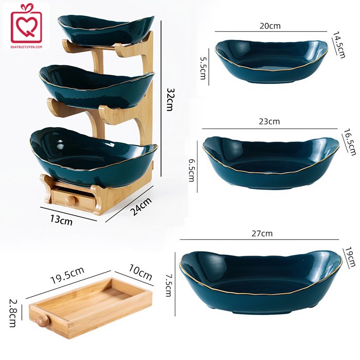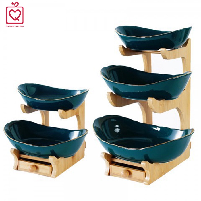 Bộ đĩa sứ giá gỗ đựng bánh mứt hoa quả có ngăn kéo được làm từ chất liệu gốm sứ tráng men sáng bóng. Bộ đĩa sứ không chỉ để đựng hoa quả, bánh mứt, các loại hạt khô tiện lợi mà hơn thế bộ sản phẩm còn tô điểm cho không gian tiếp khách của gia đình bạn thêm phần ấn tượng với những vị khách đến chơi.Đặc điểm nổi bật của Bộ đĩa sứ giá gỗ đựng bánh mứt hoa quả: