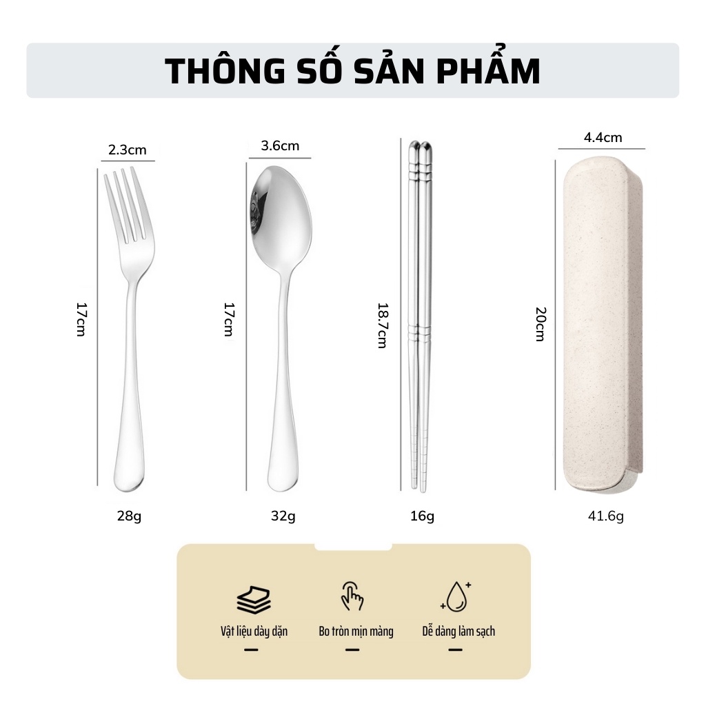 Bộ đũa dĩa thìa inox 304, chất liệu inox cao cấp không gỉ, được đánh sáng bóng bằng quy trình đánh bóng gương, đầu đũa được thiết kế chống trơn trượt. Hộp đựng bằng nhựa màu lúa mạch nhã nhặn, sang, xịn. Bộ sản phẩm bao gồm 3 chi tiết: