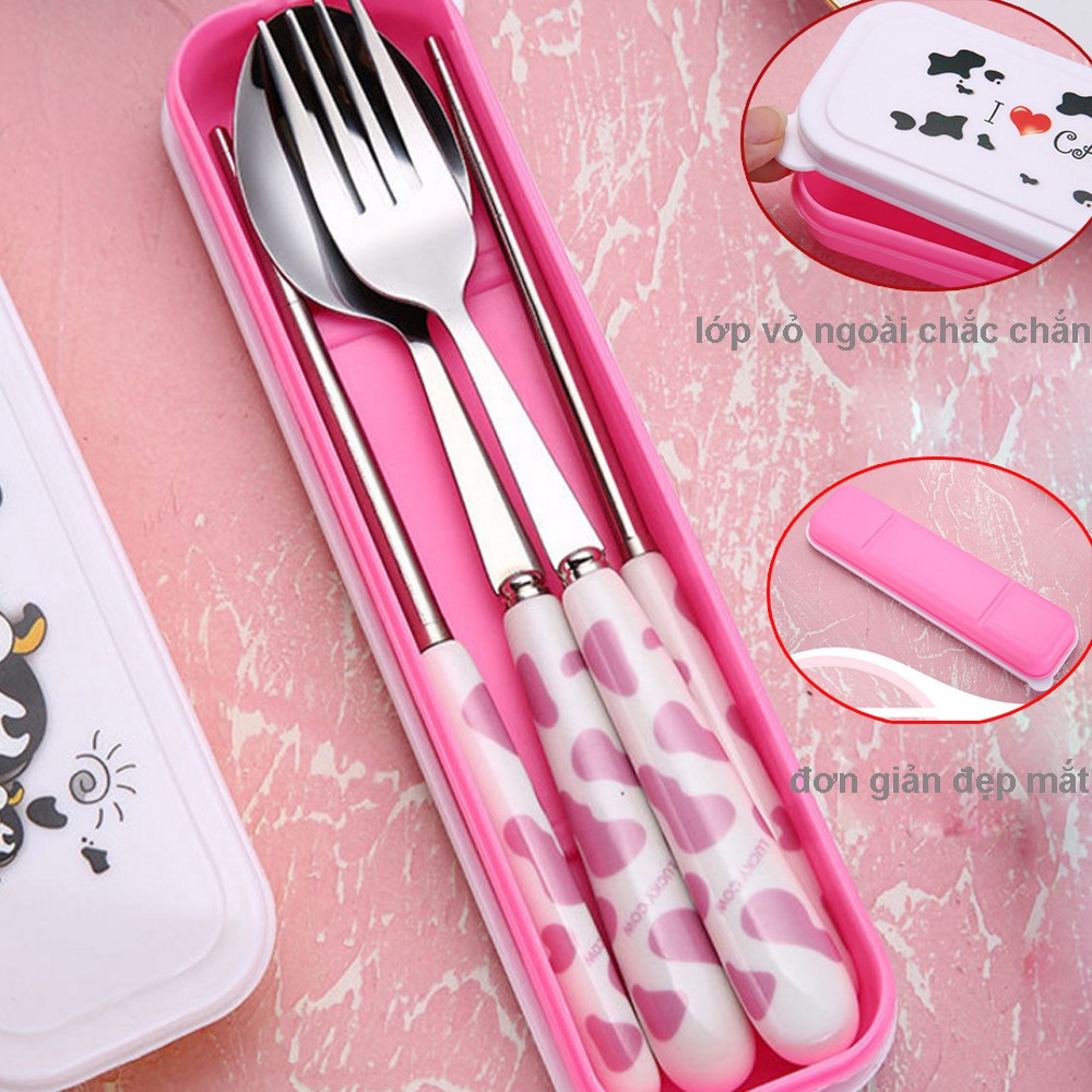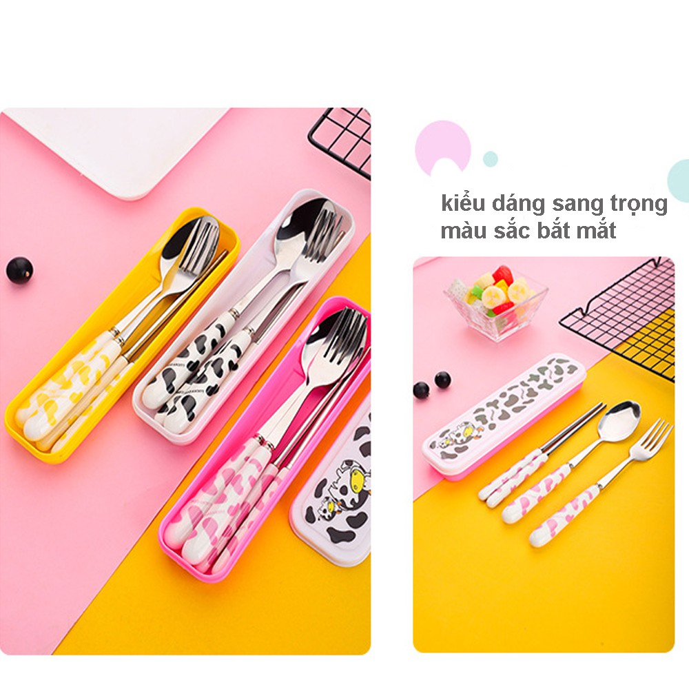 Bộ Đũa Thìa INOX 304 Họa Tiết Bò Sữa Cán Sứ Sang Trọng Có Hộp Đựng