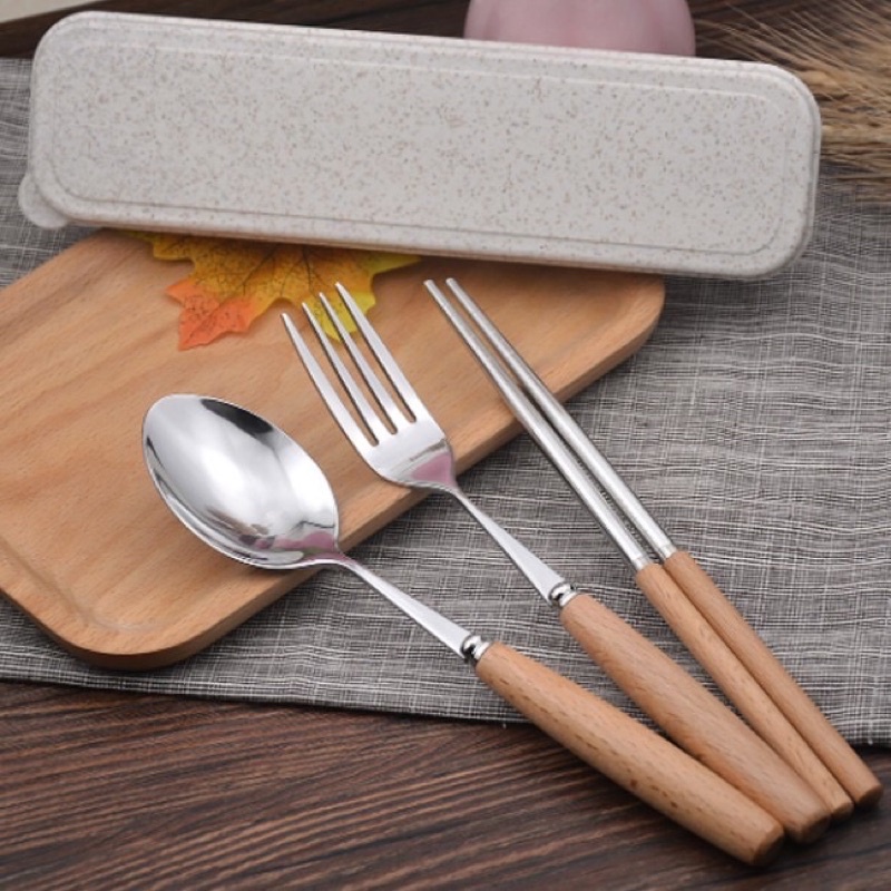 - Bộ gồm đũa, thìa và dĩa inox rất đẹp cán gỗ, đựng trong 1 hộp nhựa lúa mạch nhỏ xinh.