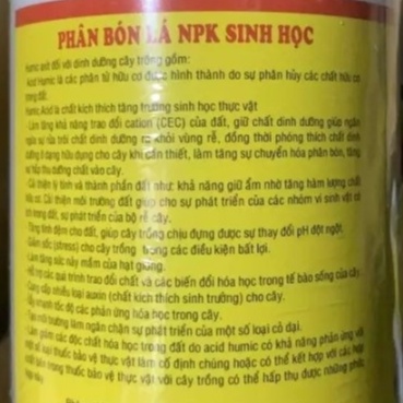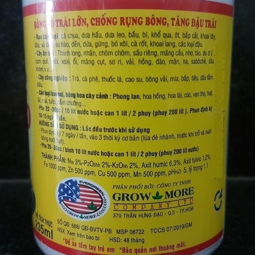 + N : 3% , P2O5 : 2% , K2O : 2% , acid humic : 6.3% , axit fulvic : 1.2% ,
