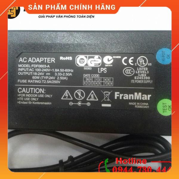 Adapter nguồn ROHS FDF0603-A 24V 2.5A - Adapter chất lượng cao cấp và bền bỉ giúp cung cấp dòng điện an toàn khỏe mạnh cho các thiết bị điện tử như máy in hóa đơn, máy Scan, Camera, đèn led...Không giống như các dòng Adapter 24V 2.5A chân 5.5mm * 2.5mm giá rẻ không trang bị mạch bảo vệ chống quá áp, sụt dòng, sử dụng 1 thời gian rất nhanh hỏng và dễ làm giảm tuổi thọ của thiết bị thì với Adapter nguồn ROHS 24v 2.5a bạn có thể hoàn toàn yên tâm và tin tưởng sử dụng. Sản phẩm bảo hành lên tới 12 tháng 1 đổi 1 chỉ có tại Đại lý
