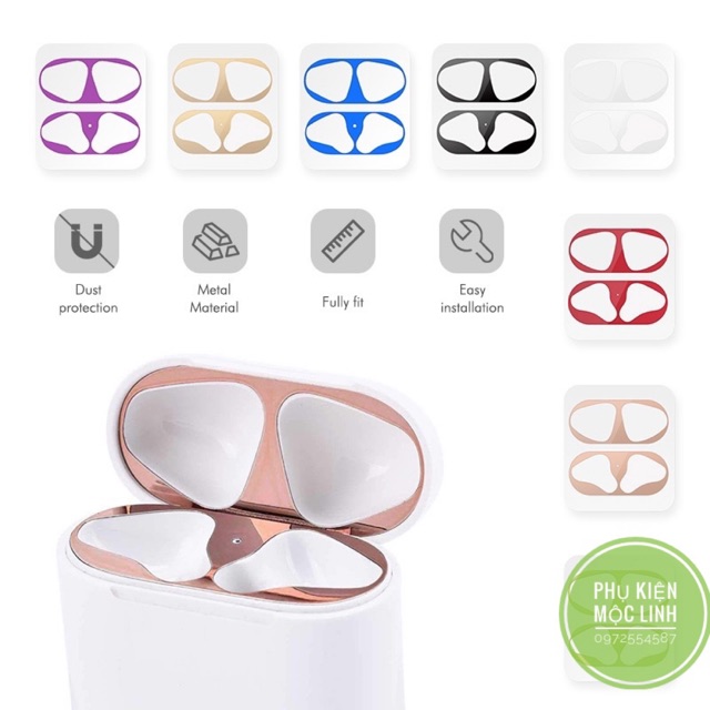 Bộ dán tai nghe Airpods gồm:+ Miếng dán kim loại tùy chọn màu sắc