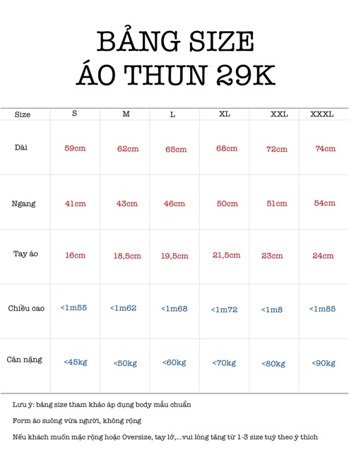 Size tham khảo (lưu ý đây là áo form suông vừa, không rộng)