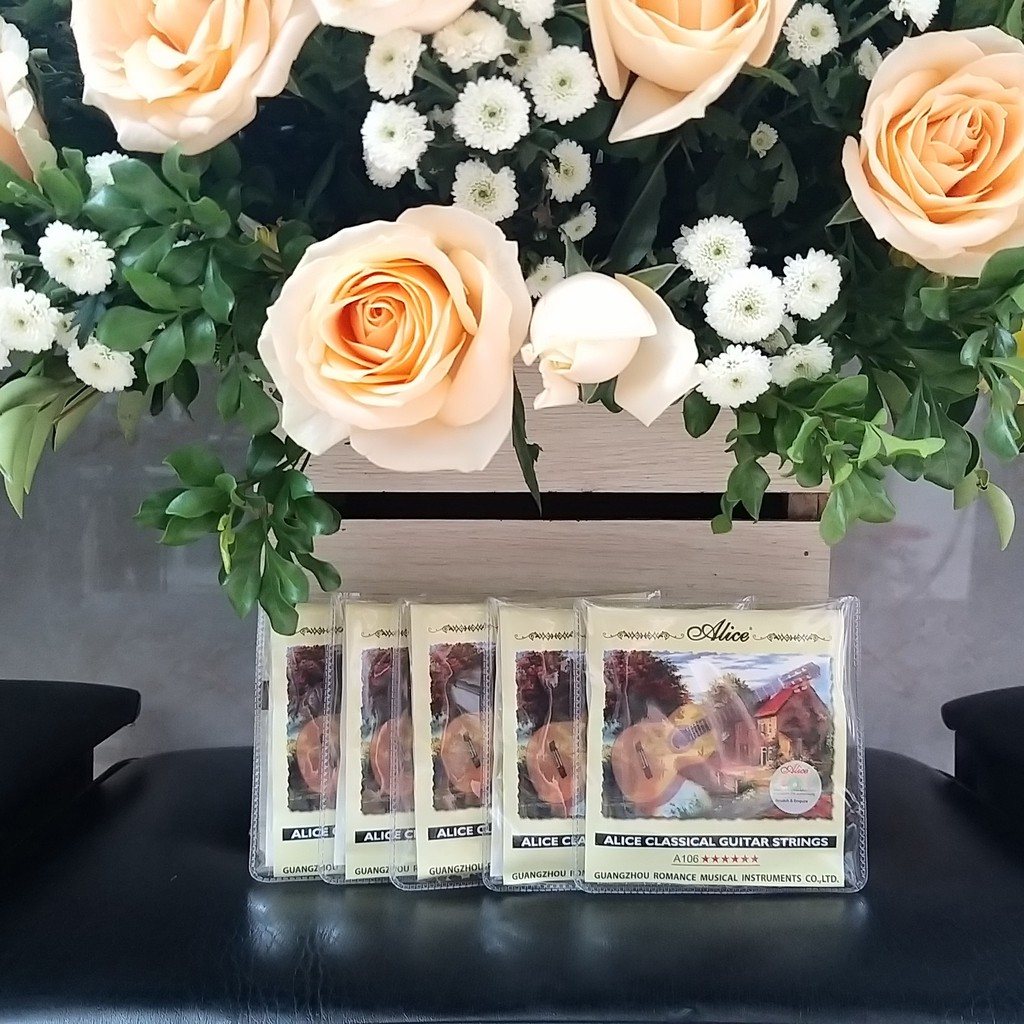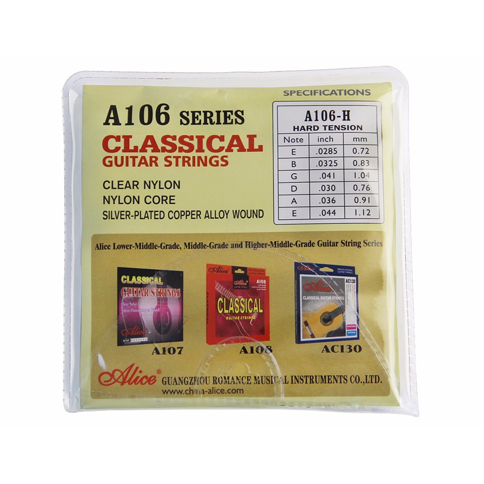 Chọn đúng loại dây cho đàn giutar classic rất quan trọng, vì dây đàn sẽ quyết định hỗ trợ hoặc làm hỏng âm thanh và lối chơi guitar của bạn. Giữa rất nhiều dây guitar, có thể sẽ rất khó để lựa chọn loại dây nào phù hợp nhất với chiếc đàn guitar. Dây đàn thuộc loại Low tension: trầm ấm, vang to và rất classical; tremolo hay: dùng loại Low tension thì tremolo sẽ đều đặn hơn; vibrate sợi dây, nhéo dây dễ hơn, vì dây rất nhão; đàn đánh được nhẹ hơn, good feeling; ép dây, dây sẽ không bị nhoè qua dây khác. Loại Hard tension: nhiều Treble, âm thanh nghe rõ ràng, âm thanh bay đi như mũi tên, sắc bén hơn; móc dây, ép dây, âm thanh nghe nhẹ nhàng và đầy đặn. Còn loại Normal tension: trung tính nhất, nằm ở giữa Low và Hard Tension. Có thể nói dùng phổ thông nhất.Dây đàn guitar classic Alice A106 thuộc loại trung bình, không quá mỏng cũng không quá dày, phù hợp với những bạn nào chơi đàn classic mà vẫn không quá nặng, không làm đau tay người dùng. Dây đàn guitar classic Alice A106 là dòng sản phẩm dây nylon của hãng Alice. Các dây đàn E-1, B-2, G-3 được làm từ nylon nhập khẩu, và D-4, A-5, E-6 được quấn tự động bằng đồng mạ bạc. Dây đàn Alice A106-H cung cấp cho cây đàn guitar của bạn giai điệu sáng và phong phú. Đây là loại dây phổ biến, được nhiều người yêu thích. Dây đàn Alice A106-H loại Hard Tension nhiều Treble, âm thanh nghe rõ ràng, sắc nét.