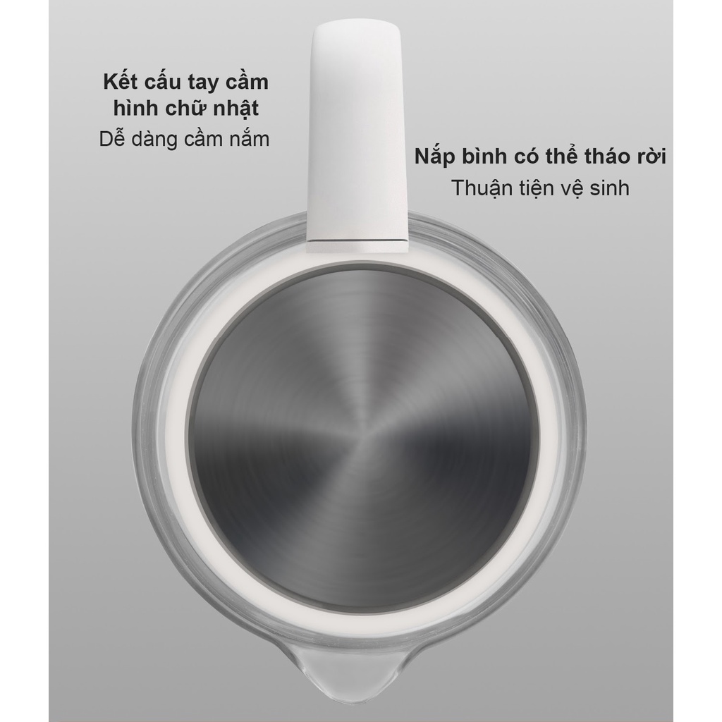 Phần tay cầm được thiết kế với kết cấu hình chữ nhật, hỗ trợ người dùng cầm nắm dễ dàng hơn. Bên cạnh đó, nắp bình cũng có thể được tháo rời linh hoạt để thuận tiện cho việc vệ sinh. Ấm đun còn được trang bị công tắc đèn LED ở cần gạt, hỗ trợ nhắc nhở người dùng trạng thái hoạt động.