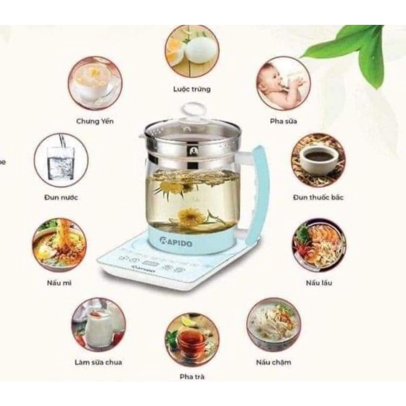 Không chỉ đơn thuần là một ấm đun nước, ấm điện đa năng Rapido còn được thiết kế đến 24 chức năng nấu tiện lợi, giúp bạn sử dụng một cách đơn giản và dễ dàng. Ấm điện Rapido có thể được sử dụng linh hoạt từ việc nấu nước pha trà, đun mì, luộc trứng đến các món cần thời gian dài như hầm, đun thuốc, nấu lẩu,… hay đơn giản là dùng để hâm đồ ăn nhanh chóng mà không cần tới lò vi sóng.