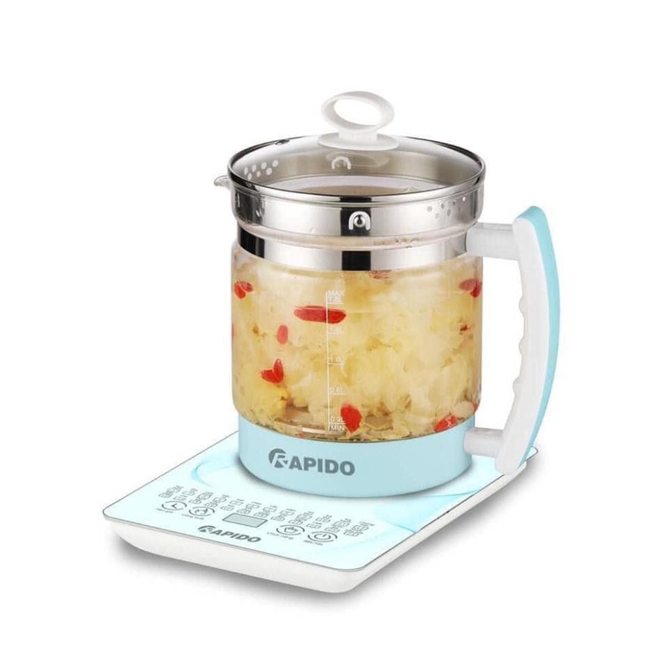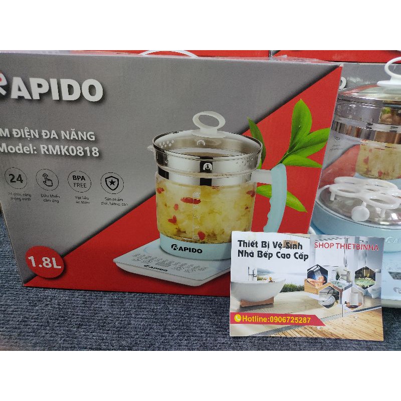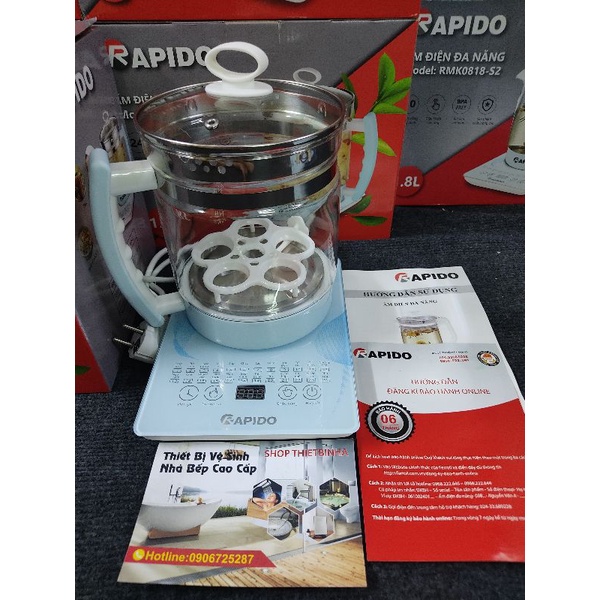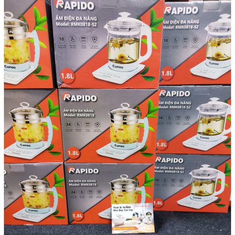 ẤM ĐIỆN DA NĂNG RAPIDO RMK0818-SKhông đơn thuần là ấm đun nước thông thường, ấm điện đa năng Rapido với 10 chế độ nấu tự động sử dụng dễ dàng, nhanh chóng và tiện lợi. Ngoài chức năng nấu nước ấm điên đa năng Rapido còn là ấm pha trà, cà phê tự động, nồi hầm các món dinh dưỡng yêu cầu thời gian dài như sắc thuốc bắc, hầm cháo, chưng yến ….hay nồi đa năng tiện dụng dành riêng cho dân văn phòng như nấu mì, nấu súp, nấu lẩu, và các món tráng miệng như sữa chua, chè,… hâm đồ ăn nhanh tiện lợi mà không cần tới lò vi sóng, không sợ sóng viba ảnh hưởng tới sức khỏe: hâm sữa, hâm rượu, hâm đồ ăn thừa,…