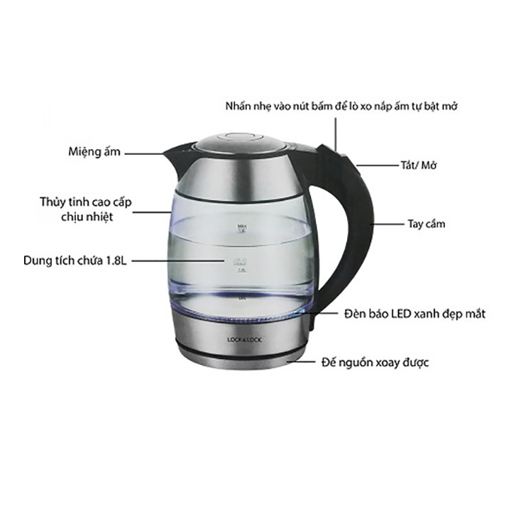 Thông tin sản phẩm: Ấm Điện Đun Nước Bằng Thủy Tinh Lock&Lock 1 lít 8 EJK418SLV