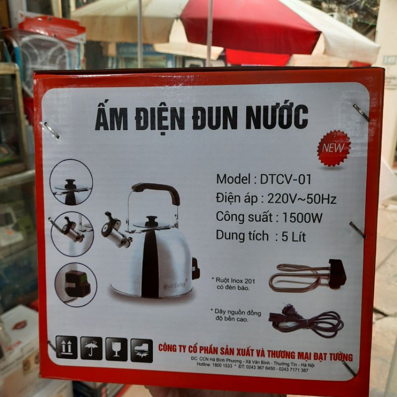 Sản phẩm ấm điện đun nước Đạt Tường với dung tích 5 lít , thân ấm được làm bằng inox 201 , ruột ấm là inox 201 có đèn báo , dây nguồn ấm bằng đồng , có sức chịu tải lên tới 2200wModel : DTCV - 01