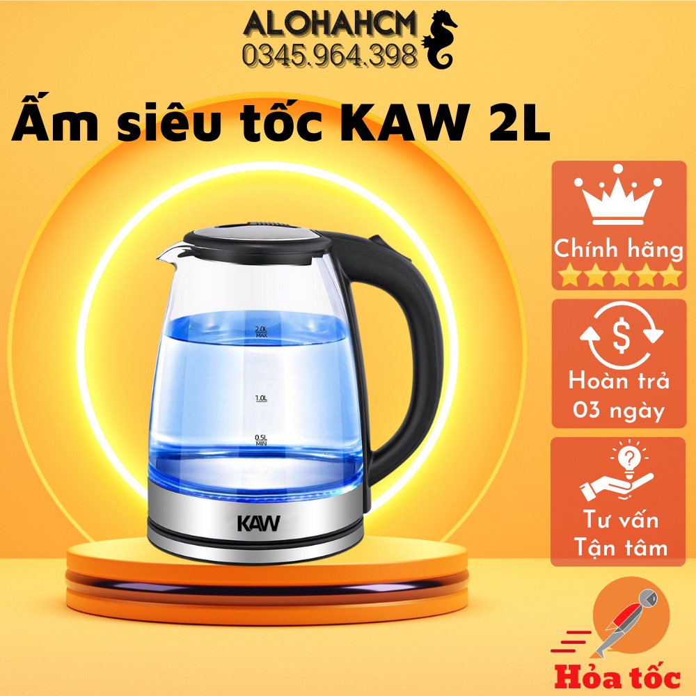 Ấm điện đun nước siêu tốc KAW dung tích 2L, bình dun nước thủy tinh trong suốt có đèn led, bảo hành chính hãng
