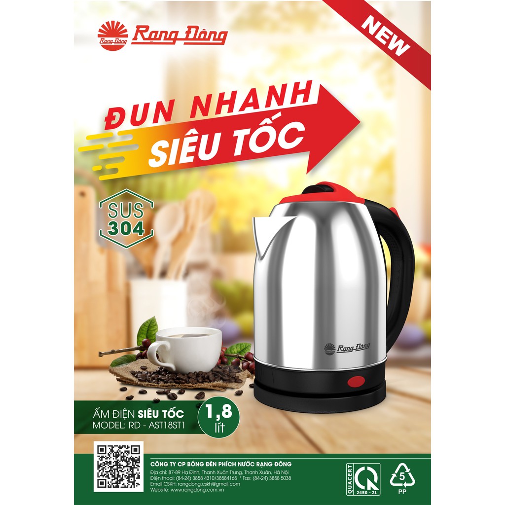 Thiết Bị Điện Gia Dụng > Đồ gia dụng nhà bếp > Ấm đun siêu tốc || Ấm điện siêu tốc ấm điện nhiều màu RẠNG ĐÔNG 1,8 lít RD-AST18ST1Còn hàng