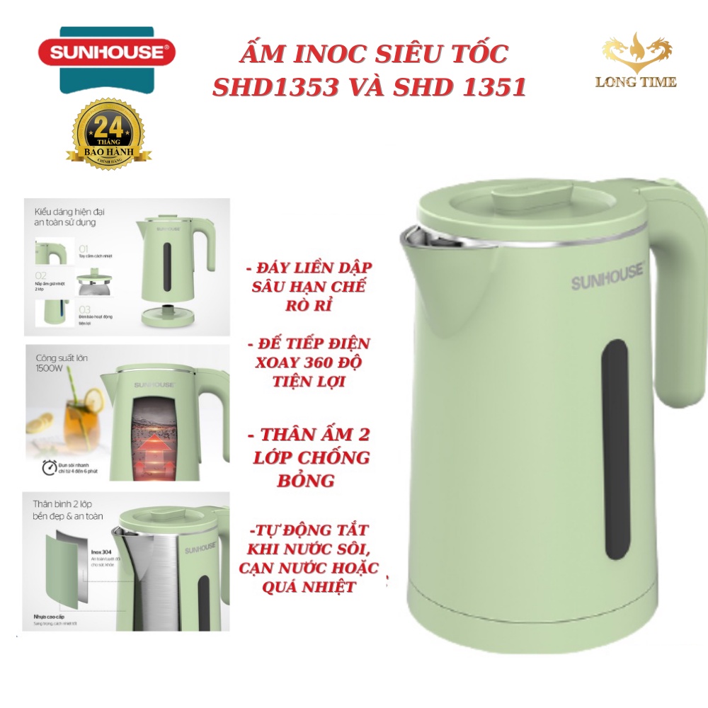 Thiết Bị Điện Gia Dụng > Đồ gia dụng nhà bếp > Ấm đun siêu tốc || ấm điện sunhouse , bình đun nước siêu tốc , SHD1353 , SHD1351 , innox 2 lớp 1.8L , công suất lớn , Happy TimeCòn hàng