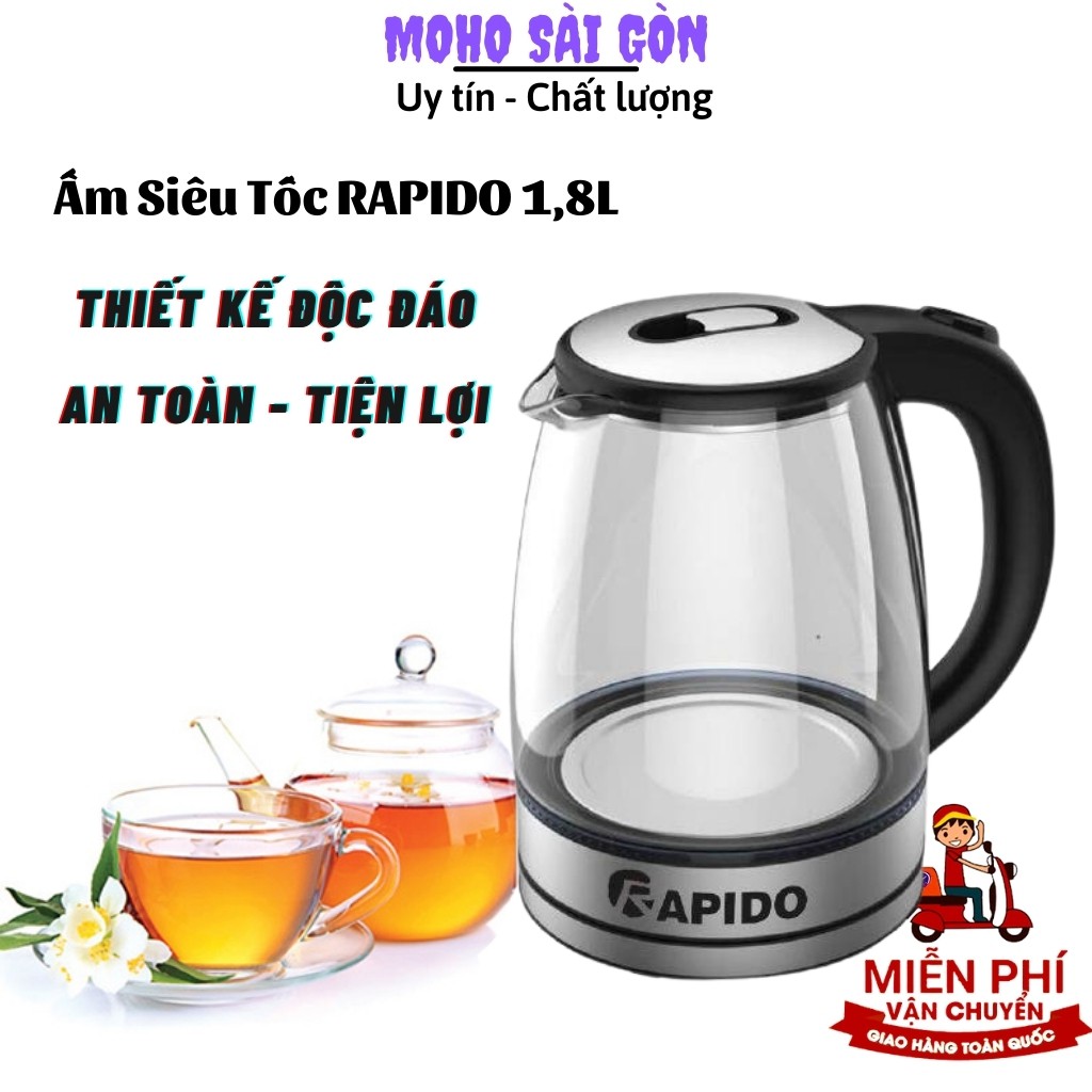Ấm Siêu Tốc Thủy Tinh Rapido RK1818 có dung tích 1,8 lít với công suất 1800W đáp ứng tốt với các nhu cầu như pha sữa, pha trà, nấu mì… của nhiều gia đình hiện nay.