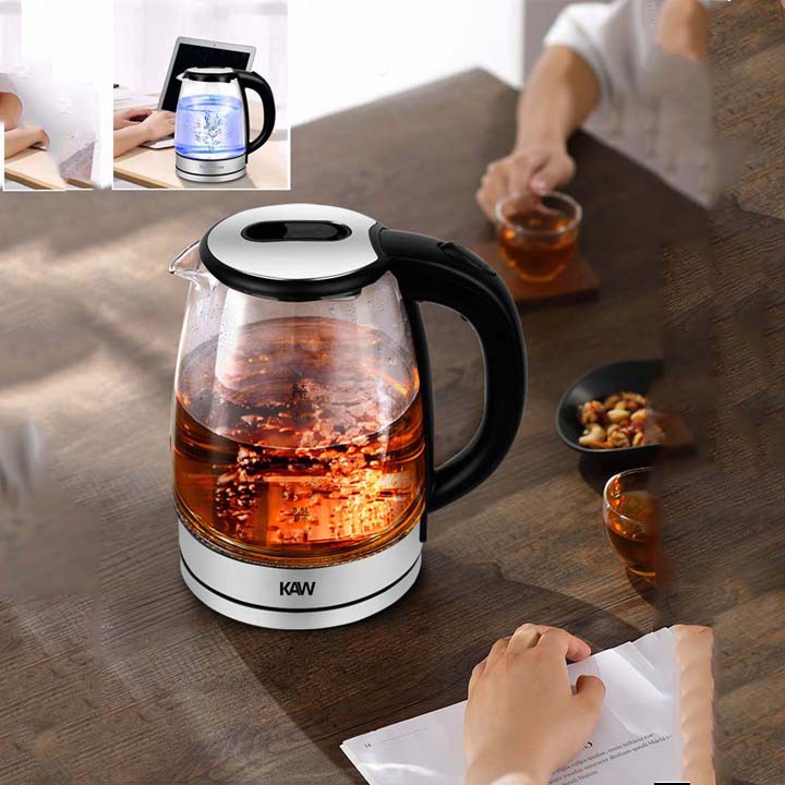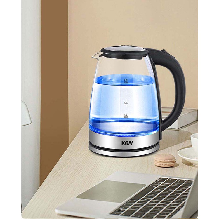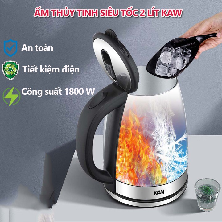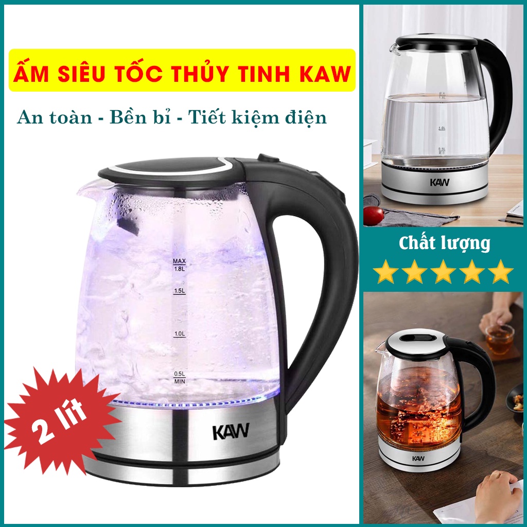 Ấm đun nước siêu tốc thủy tinh KAW cao cấp, bình đun nước siêu tốc dung tích 2L, an toàn, bảo hành uy tín