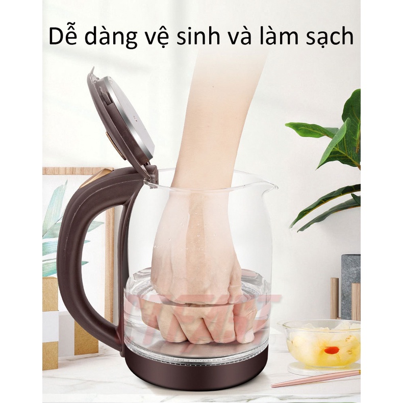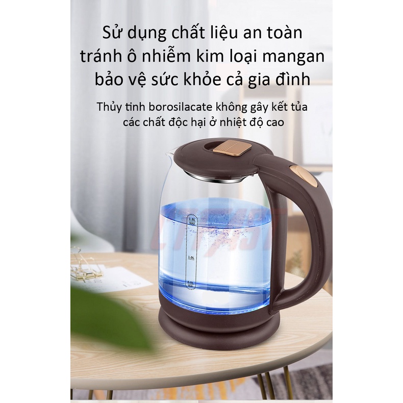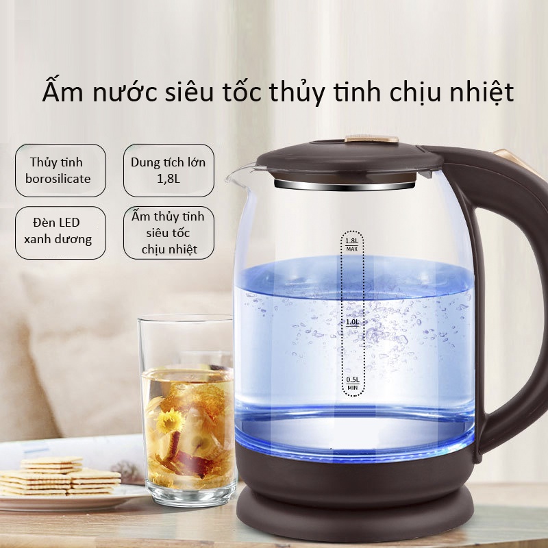 - Bình đun siêu tốc được tích hợp chế độ ngắt điện tự động khi nước sôi hoặc khi cạn nước. Bên cạnh đó, thân bình bằng thuỷ tinh trong suốt nên bạn dễ dàng quan sát quá trình đun nước đang diễn ra.