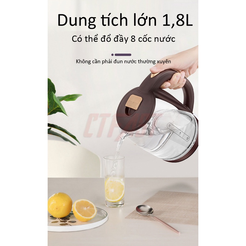- Ấm đun nước siêu tốc thủy tinh CTFAST với dung tích lên tới 1.8 lít nhưng lại được thiết kế khá nhỏ gọn, sang trọng và hiện đại, thân bình làm từ chất liệu thuỷ tinh Borosilicate chịu nhiệt đến 400 độ C, an toàn cho sức khoẻ của cả gia đình bạn.