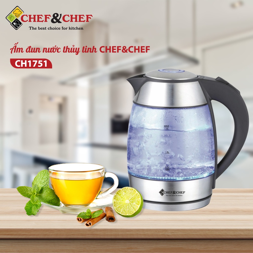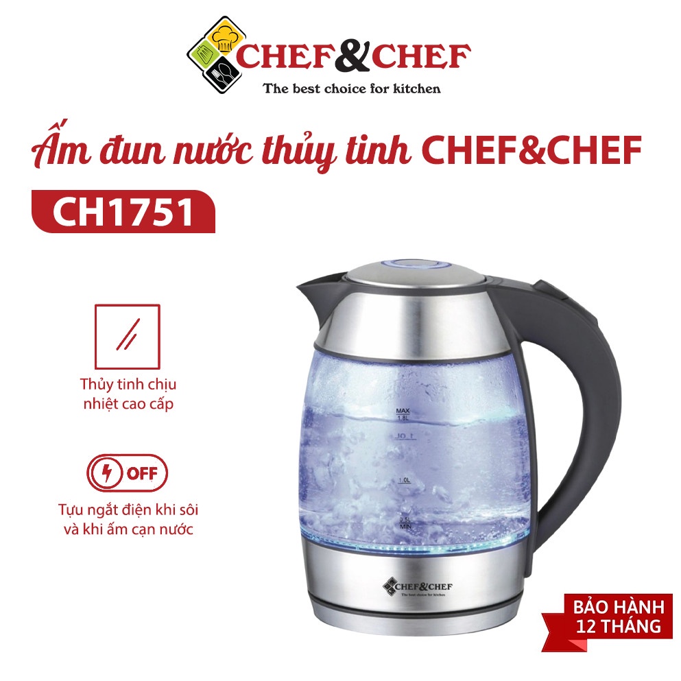 Ấm đun nước thủy tinh CHEF&CHEF CH1751 cao cấp - Thương hiệu nổi tiếng của Trung Quốc - Tối đa hiệu quả đun sôi và tuổi thọ của mâm nhiệt khi sử dụng.....