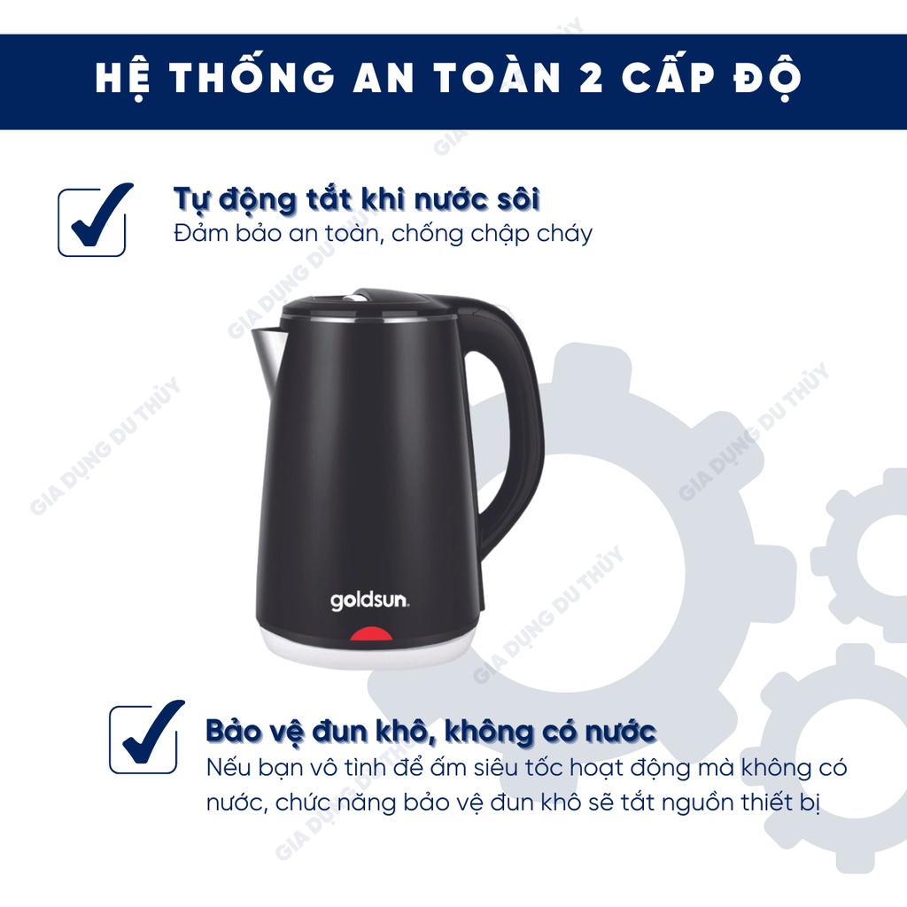 Ấm đun siêu tốc 2.2L màu đen van an toàn 2 cấp Goldsun GKT2602 kiểu dáng hiện đại, inox 304 cao cấp của gia dụng du thủy
