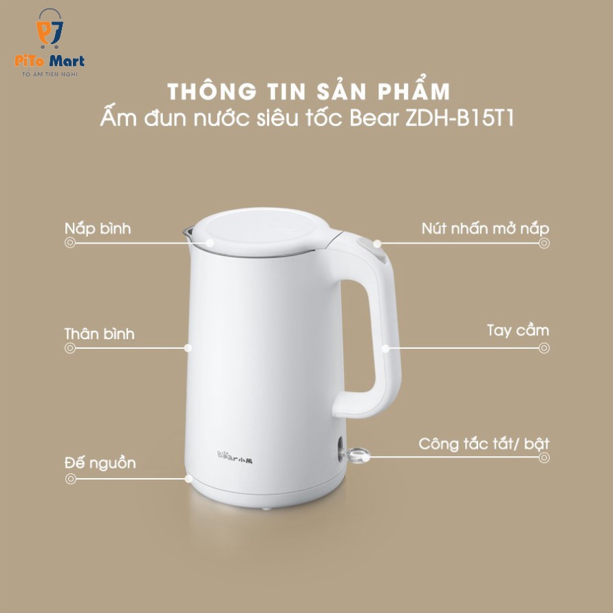 Ấm đun siêu tốc, Bình đun siêu tốc pha sữa Bear ZDH-B15T1 1.5L màu trắng công suất 1500W chính hãng - bảo hành 18 tháng1. THÔNG TIN SẢN PHẨM