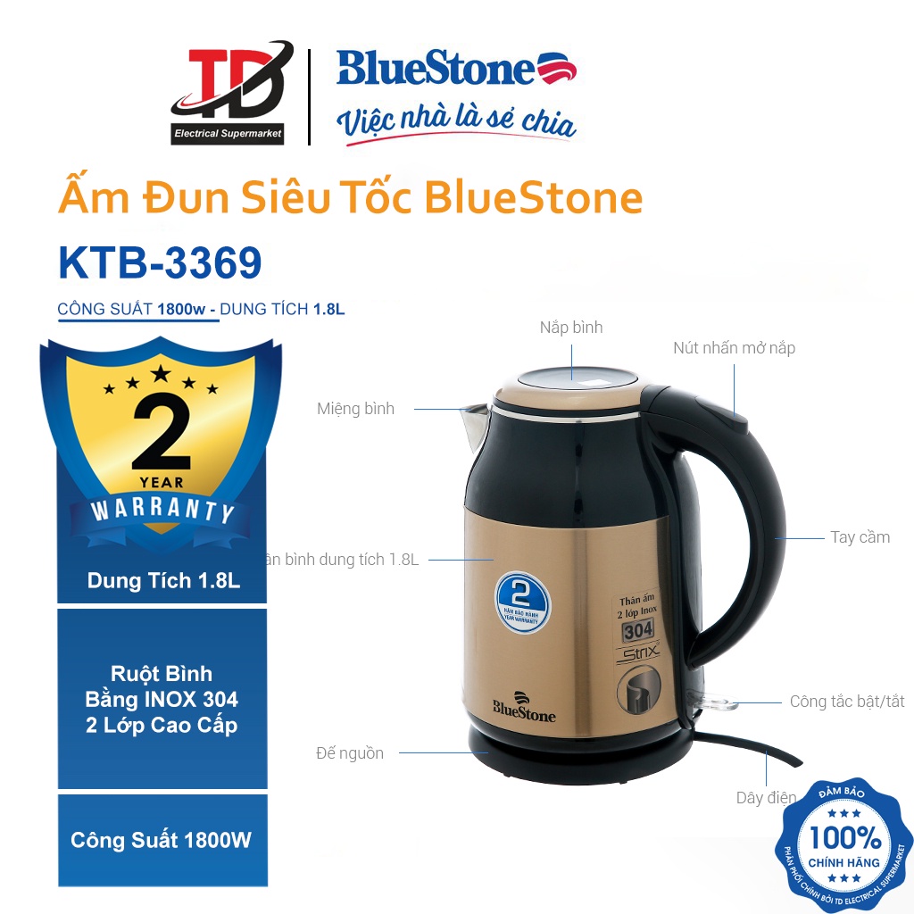 Giới thiệu Ấm Đun Siêu Tốc Bluestone 1.8 lít KTB-3369 , Inox 304 An Toàn Sức Khỏe , Bảo hành chính hãng 2 năm