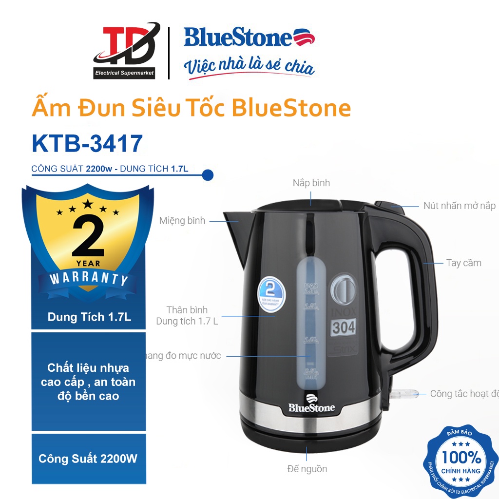 Giới thiệu [Mã ELHAMS5 giảm 6% đơn 300K] Ấm Đun Siêu Tốc Bluestone KTB-3417 , 1.7 lít -2200W , Bảo Hành Chính Hãng 2 Năm
