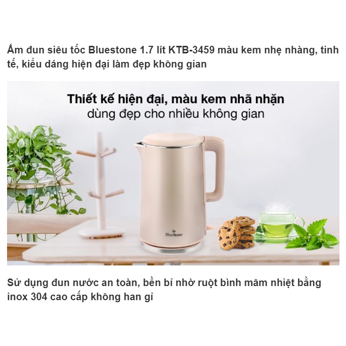 Ấm đun siêu tốc Bluestone 1.7 lít KTB-3459 màu kem nhẹ nhàng, tinh tế, kiểu dáng hiện đại làm đẹp không gianSử dụng đun nước an toàn, bền bỉ nhờ ruột bình mâm nhiệt bằng inox 304 cao cấp không han gỉ