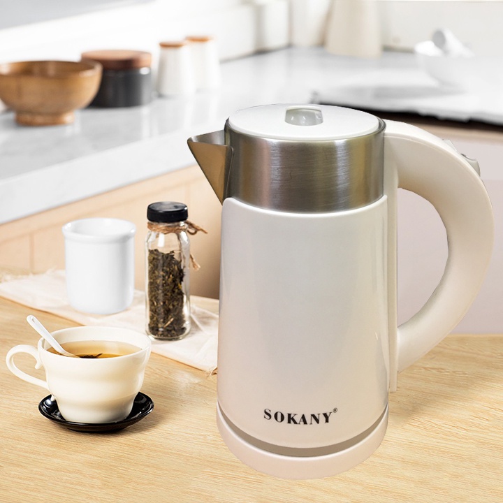 Ấm siêu tốc SOKANY 1L sở hữu thiết kế hiện đại với phần vỏ inox và nhựa cao cấp chắc chắn, tạo vẻ sang trọng cho sản phẩm.