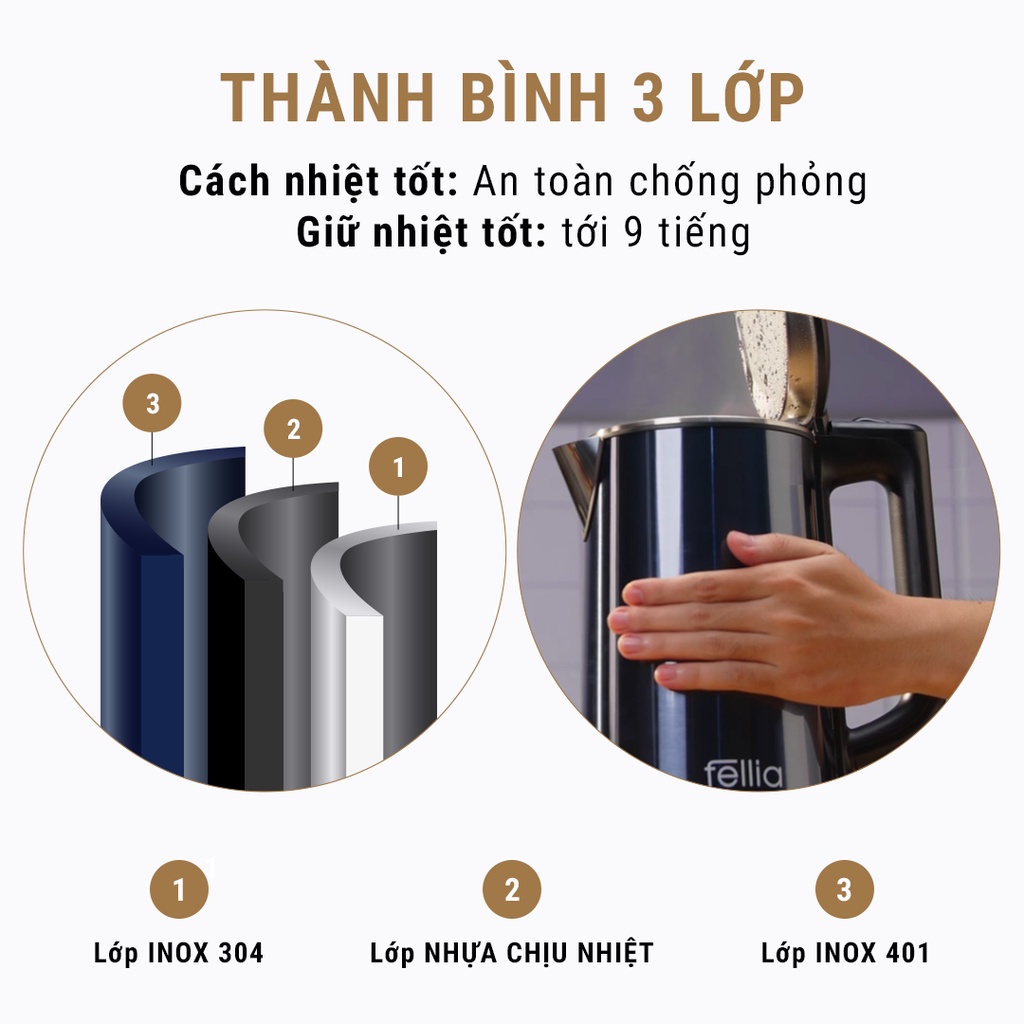 Để đảm bảo tính an toàn cho người dùng Bình Đun Siêu Tốc Fellia K161 được cấu tạo 3 LỚP thành bình chắc chắn thay gì 2 lớp như các sản phẩm thương hiệu khác: