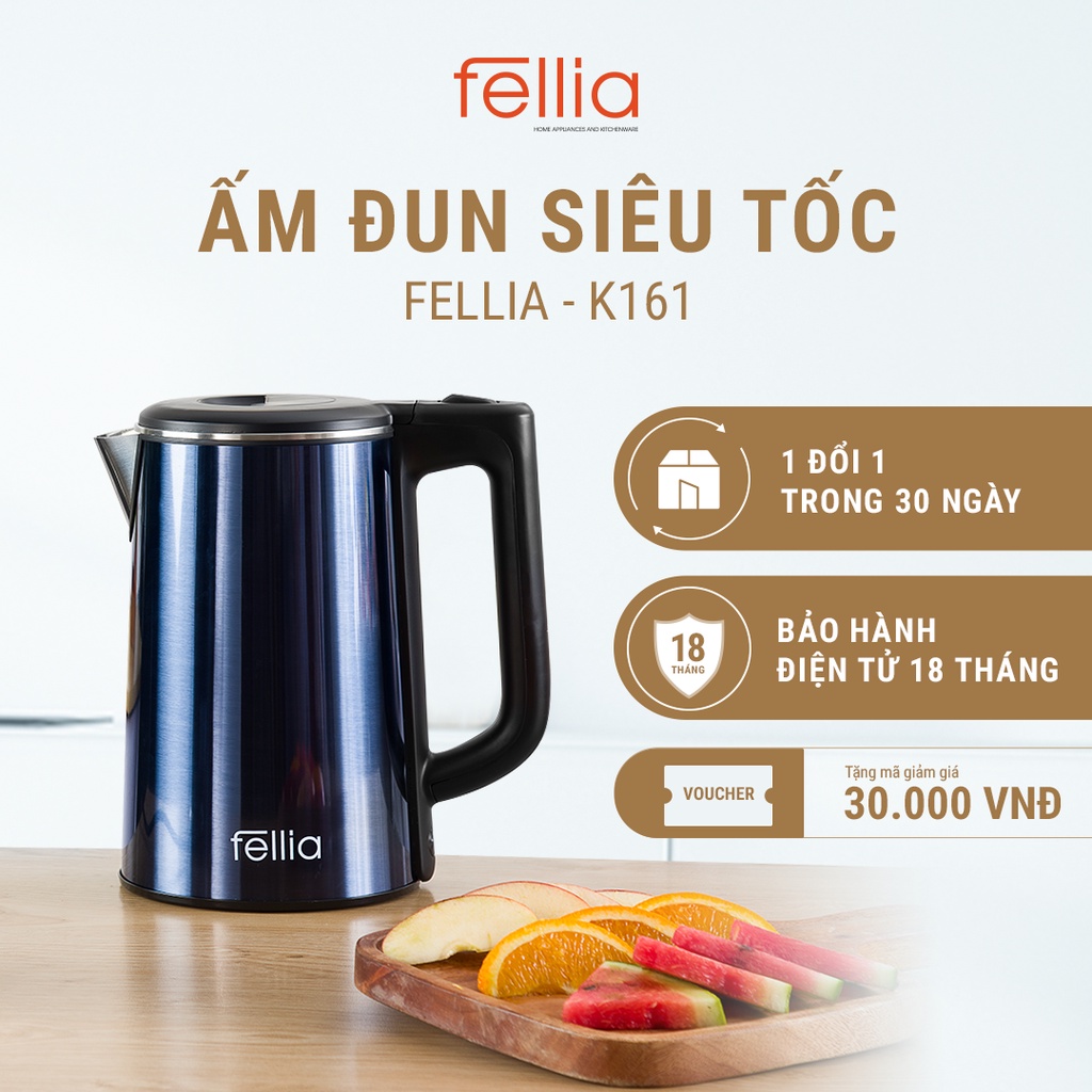 Giới thiệu Ấm đun siêu tốc Fellia K161- Thành bình 3 lớp cách nhiệt an toàn - Màu xanh - Bảo hành 18 tháng_Mua 1 đổi 1 30 ngày