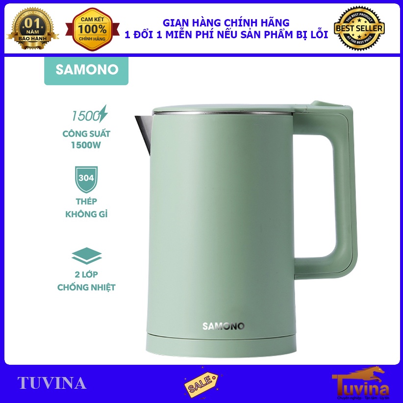 Ấm Đun Siêu Tốc Inox 304 SAMONO SW-R1 2 Lớp Chống Nhiệt 1500W 1.8L - Hàng Chính Hãng (Bảo Hành 12 Tháng)