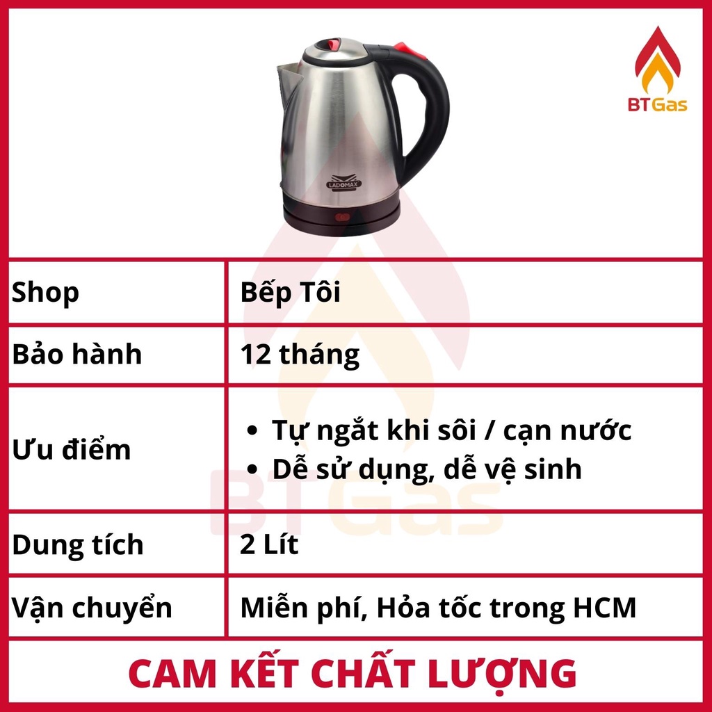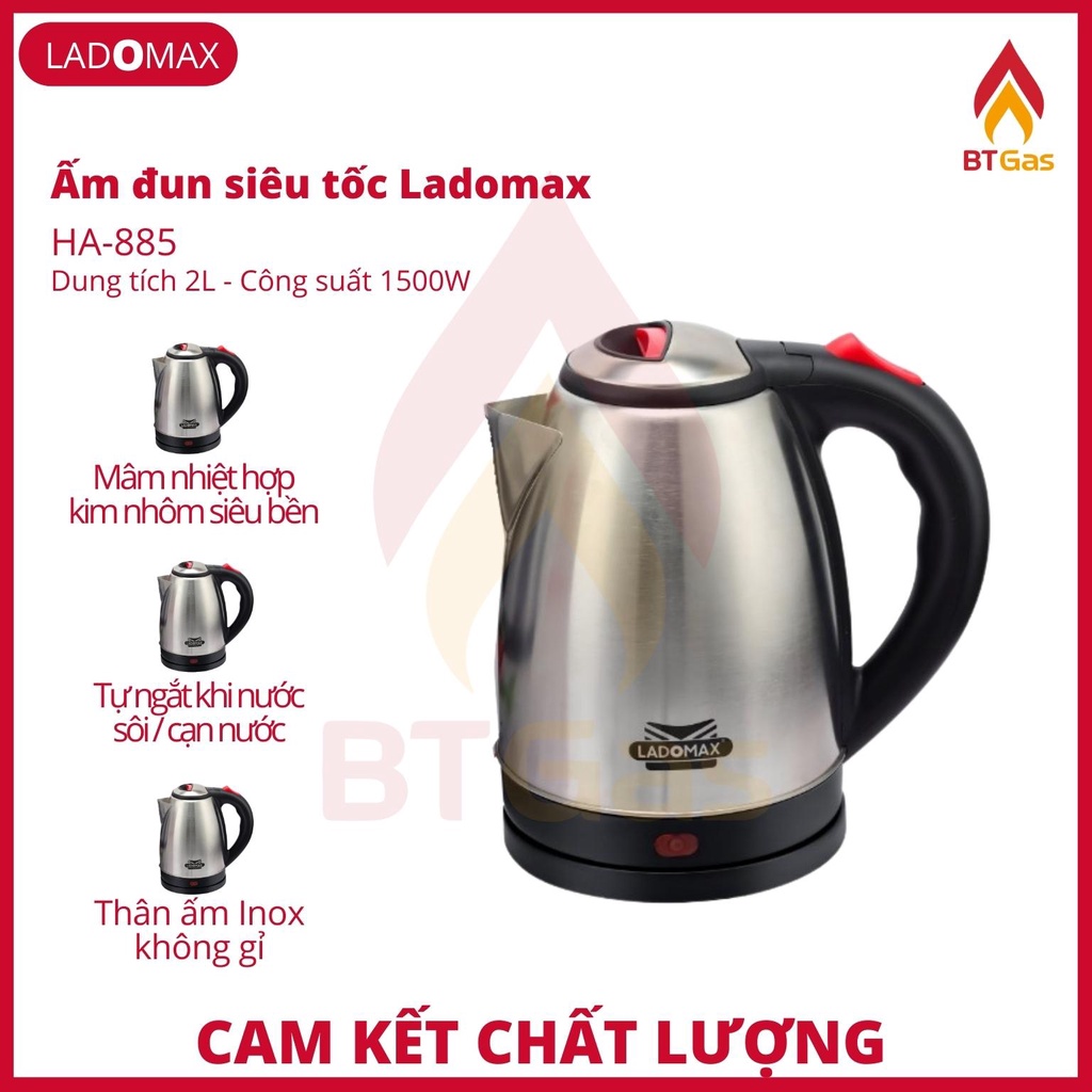 Ấm đun siêu tốc Ladomax 2L, bình siêu tốc Inox công suất 1500W HA-885