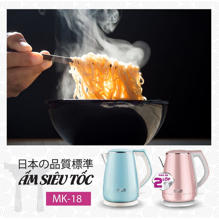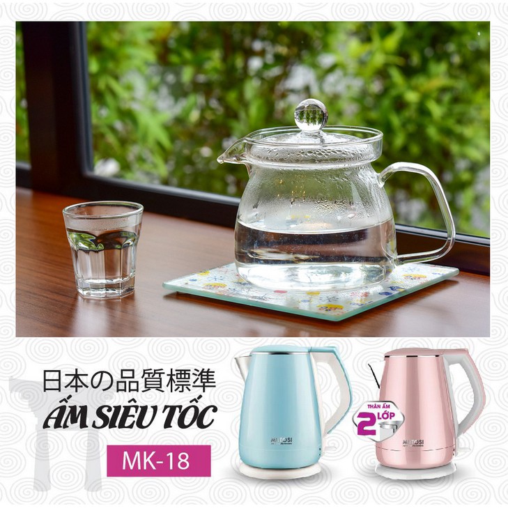 Giới thiệu Ấm đun siêu tốc Mutosi MK-18 (hồng), 1.5L, thân ấm 2 lớp cách nhiệt siêu bền, công nghệ Nhật Bản, bảo hành 24 tháng