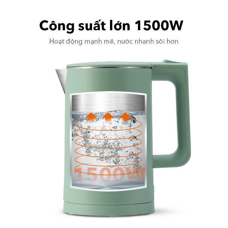 + Công suất 1500W cho thời gian nấu nước nhanh chóng, giúp tiết kiệm điện năng tối đa, đồng thời không sản sinh ra các chất độc hại dưới tác động của nhiệt độ cao.