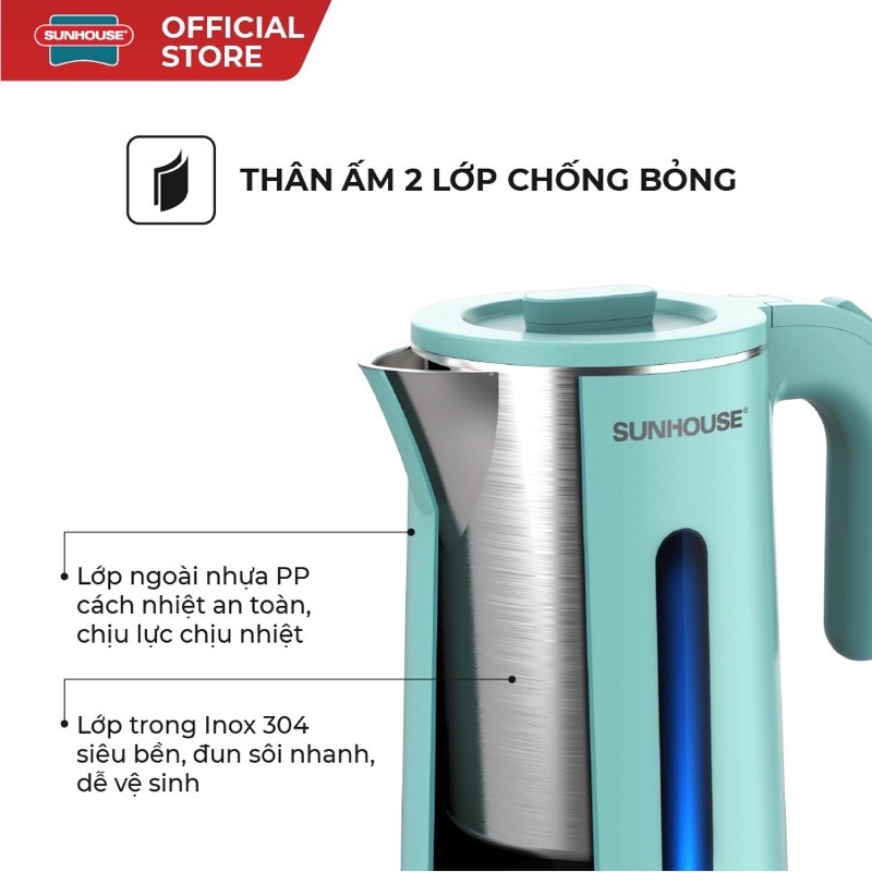 - Đặc biệt, ấm siêu tốc inox 304 2 lớp 1.8L SUNHOUSE SHD1351 còn được trang bị đèn báo hoạt động vừa tiện lợi, vừa tăng tính thẩm mỹ.