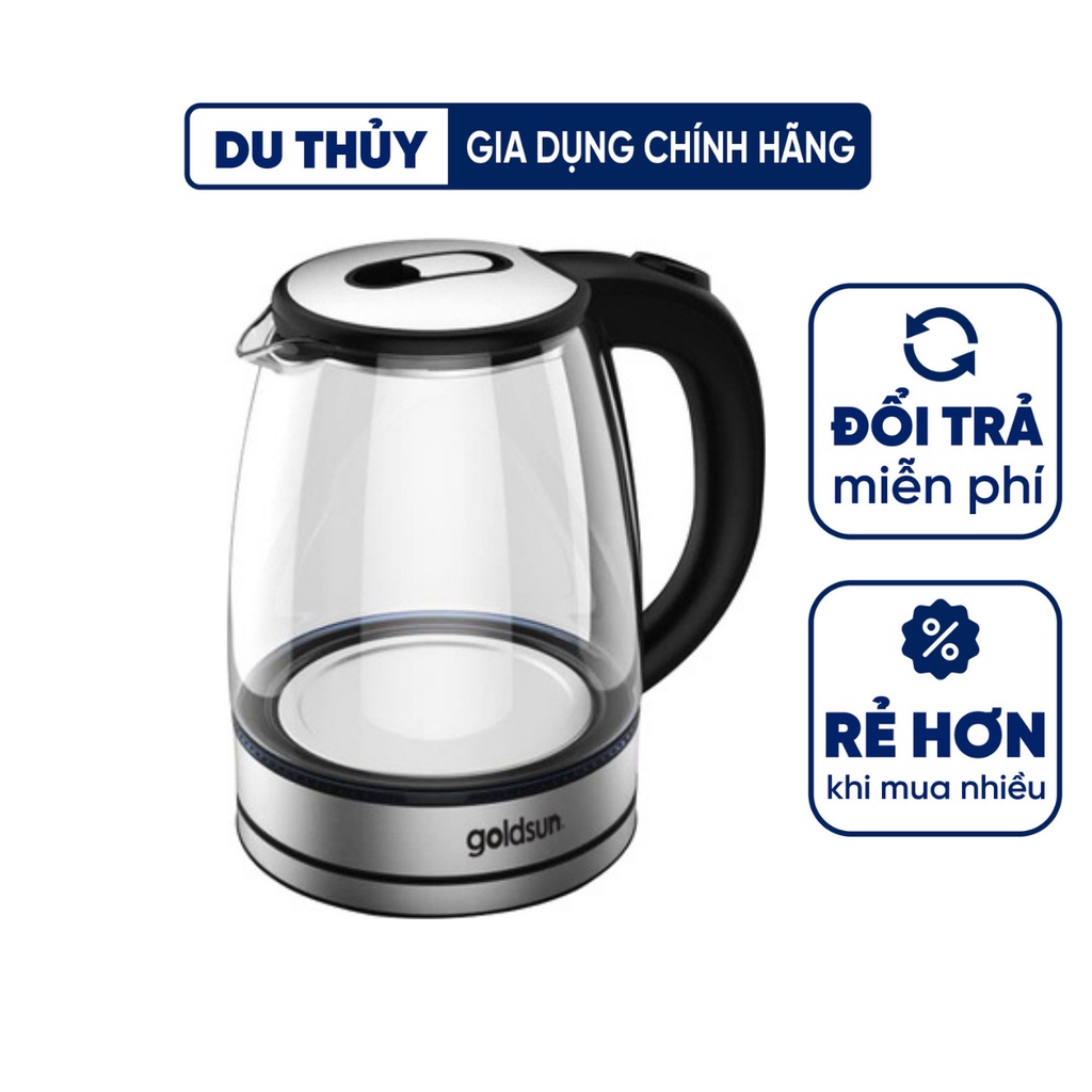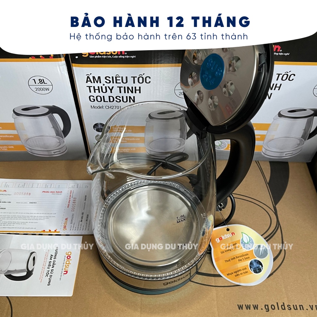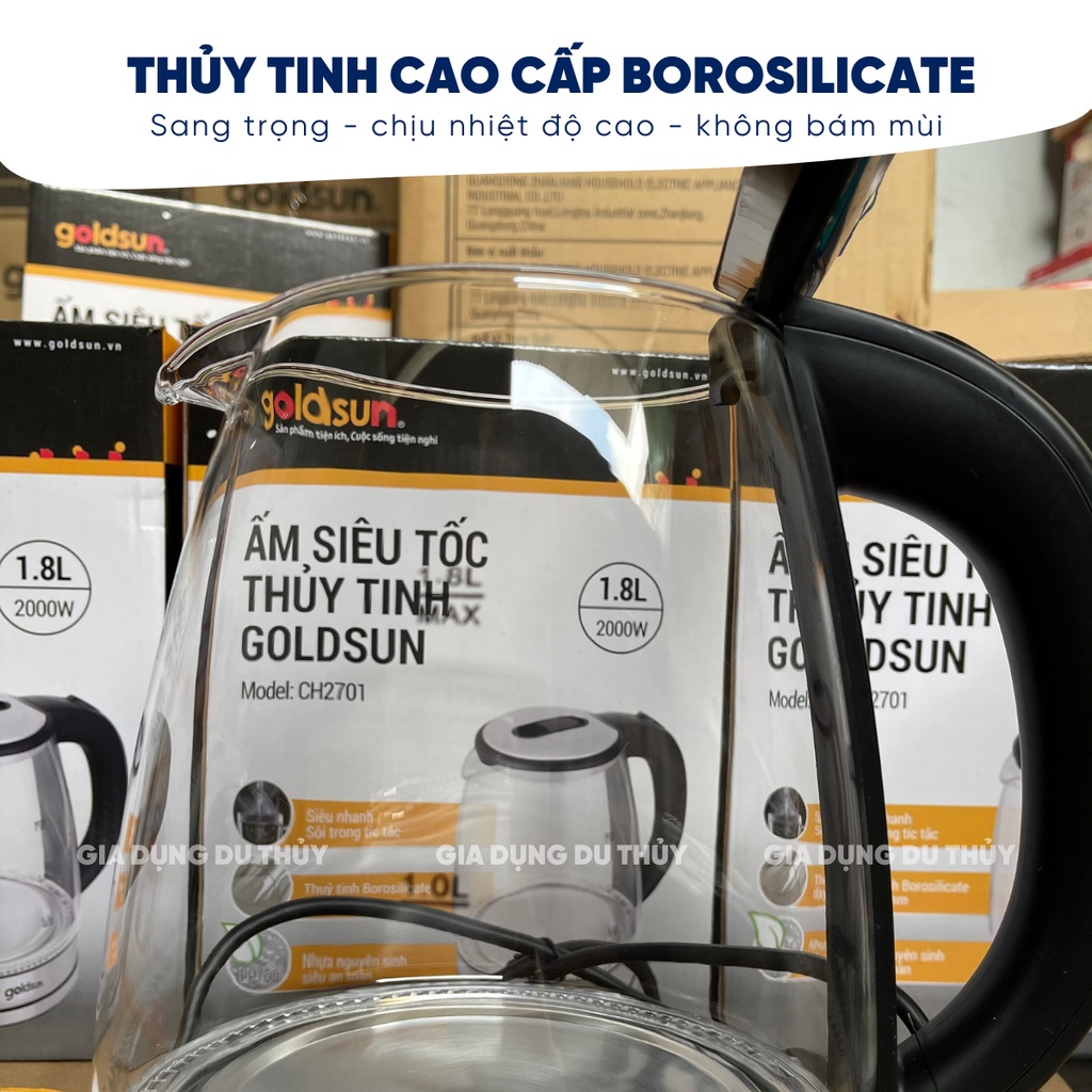 Ấm đun siêu tốc thủy tinh cao cấp Goldsun dung tích 1L8 chịu nhiệt cao, đun sôi nhanh không sinh chất độc hại CH2701