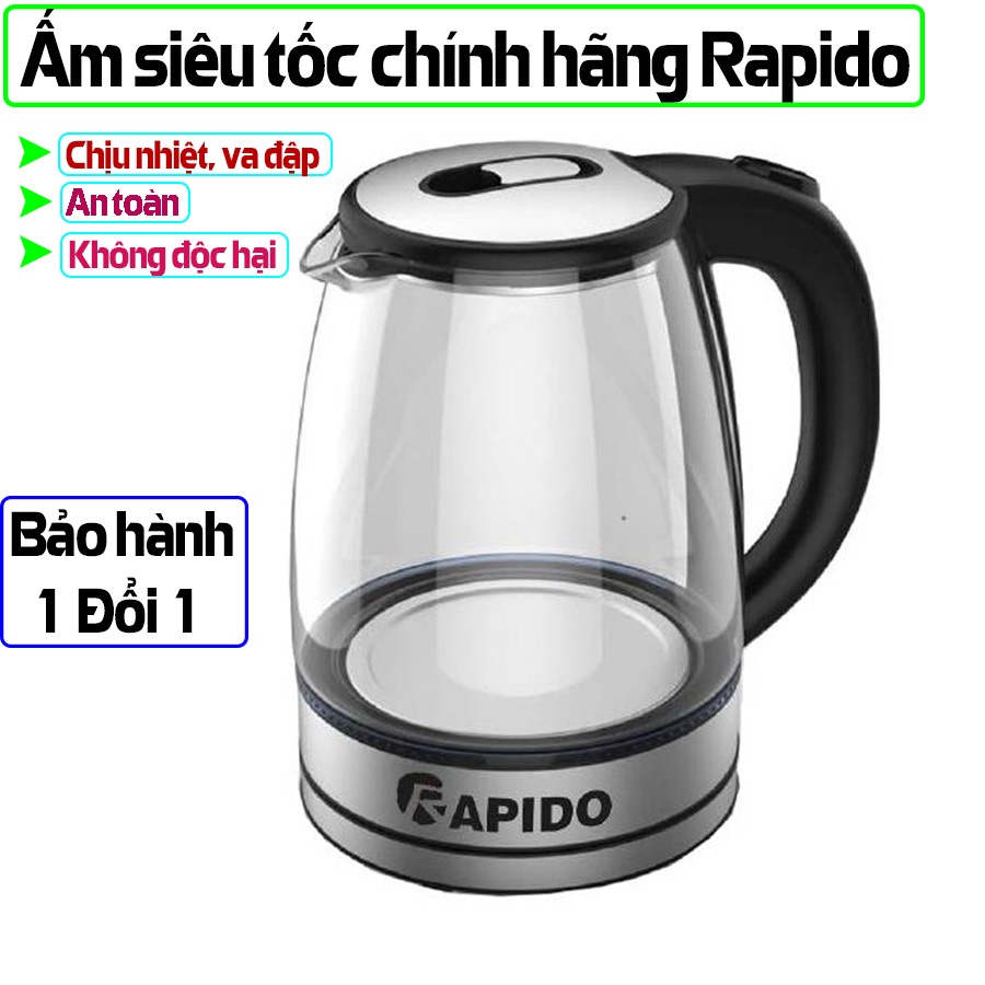 Ấm đun siêu tốc thủy tinh dung tích 1,8 Lit -Bình đun thủy tinh thương hiệu Rapido - Công suất 1800W - BẢO HÀNH UY TÍN