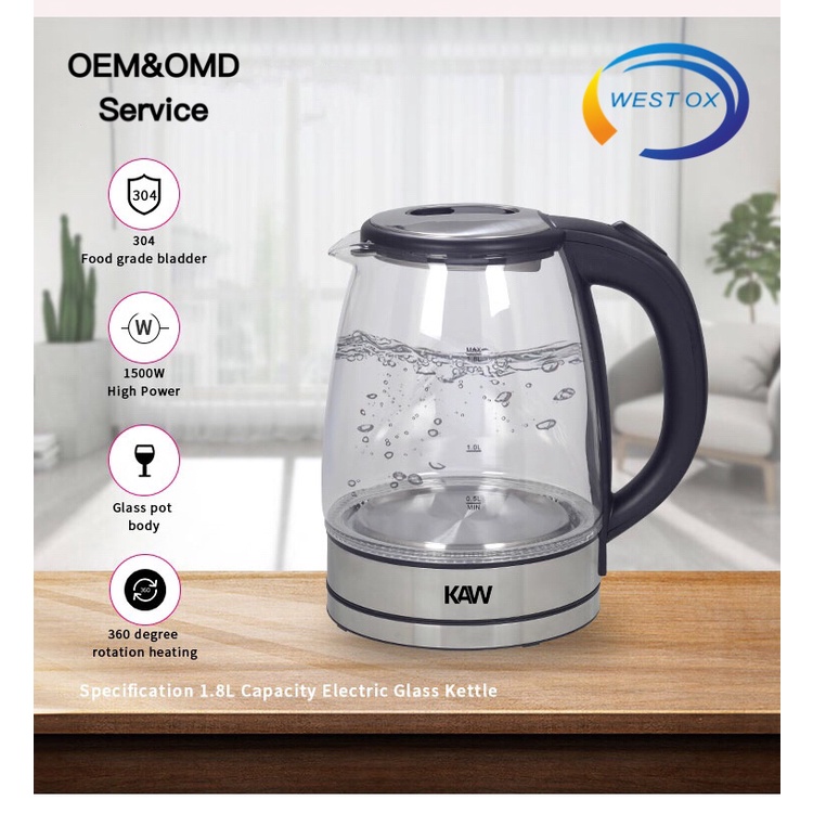 Ấm đun siêu tốc thủy tinh KAW RK1818, chất liệu thủy tinh cao cấp chịu nhiệt dung tích 1,8 lít-công suất 1800W