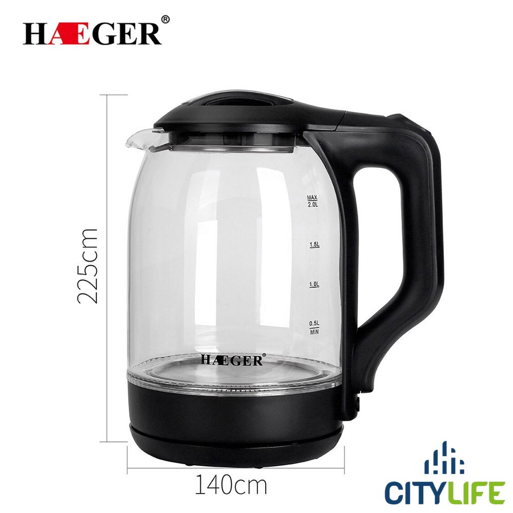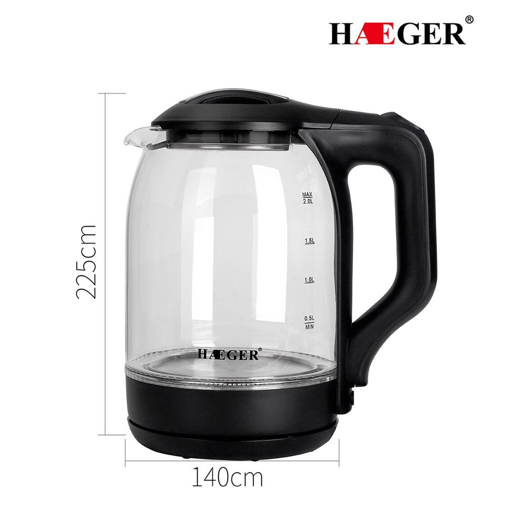 Ấm đun siêu tốc thủy tinh chính hãng HAEGER bình đun nước dung tích 2L công suất lên đến 2000W đun sôi chỉ từ 4 phút