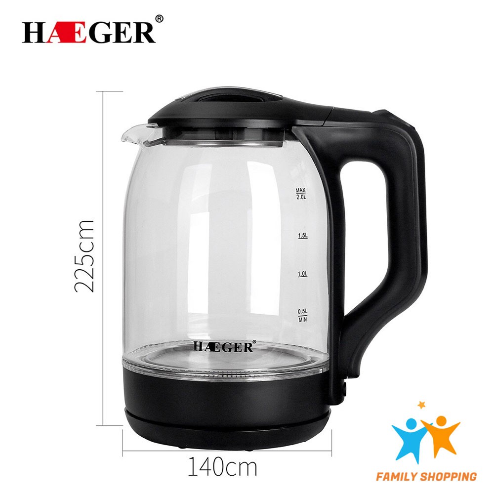 Ấm đun siêu tốc thủy tinh HAEGER 2 lít, bình đun nước thủy tinh trong suốt công suất 2000W