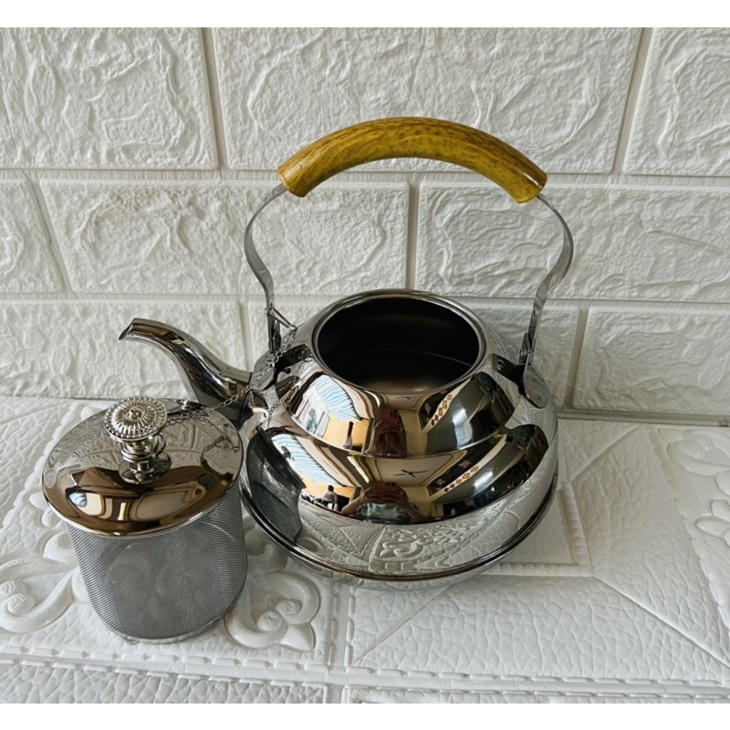 - Ấm đun nước inox được thiết kế an toàn và tiện dụng tay cầm giả gỗ cách nhiệt- Kèm theo 1 son lọc trà bằng inox khít với lòng ấm giúp người dùng có thể trực tiếp rót trà ra uống không cần thông qua túi lọc rời để hãm bã trà ra.